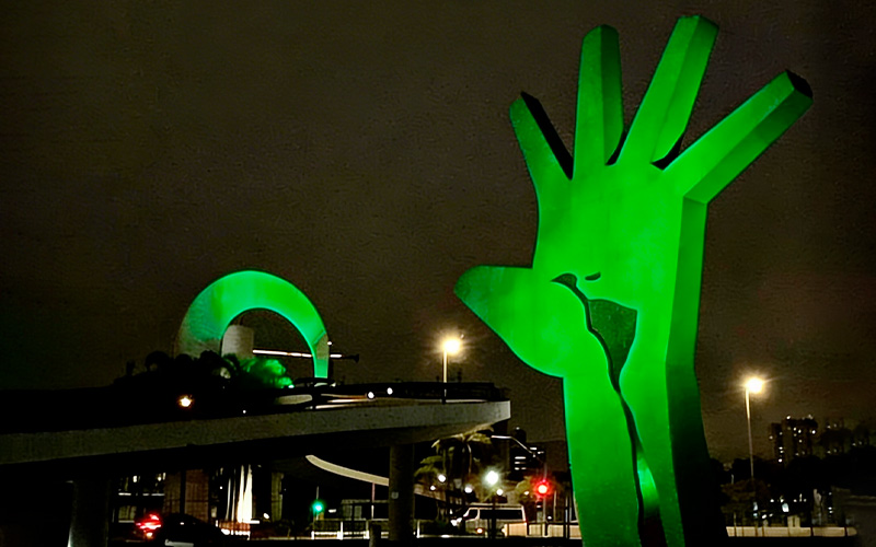 Durante o mês de abril, o Memorial da América Latina se une ao movimento Abril Verde, iniciativa dedicada à conscientização sobre a prevenção de acidentes e doenças relacionadas ao trabalho. Como gesto simbólico de adesão à campanha, dois dos elementos mais emblemáticos do complexo, a Mão e a passarela, recebem iluminação especial na cor verde ao longo do período.